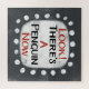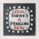 Un dessin typographique irrévérencieusement bizarre qui dit "Regarde ! Il y a un pingouin maintenant". Il présente du texte noir et rouge sur un rectangle blanc avec des points blancs amusants et amusants qui l'entourent, le tout sur un arrière - plan gris.