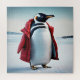 Artischer Pinguin mit einem roten Mantel auf Eis.