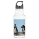 Diese Wasserflasche enthält afrikanische Pinguine, die auf einem Felsvorsprung vor einem blauen Himmel stehend sind. Sie sind wasserfreie, fliegenlose Vögel, deren Flügel zu Flossen geworden sind. Jede hat einen schwarzen Streifen und schwarze Flecken auf der Brust. Das Muster der Flecken ist für jeden Pinguin einzigartig, genau wie menschliche Fingerabdrücke. Sie haben rosa Drüsen über den Augen und rosa und schwarze Füße.