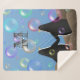 Diese niedliche Pinguin-Sherpa-Fleece-Decke zeigt zwei Pinguinfreunde, die Flossen halten und dabei einen bunten Regenbogen von Blasen beobachten, die sich um sie herum gegen einen klaren blauen Himmel treiben - die Pinguine sind unter großen braunen Felsbrocken stehend - mit Namen und Monogramm - von katz_d_zynes angepasst