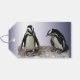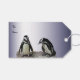 Dieses Paket von Geschenketiketten enthält zwei bezaubernde afrikanische Pinguine, die auf einem Felsvorsprung stehend sind. Sie sind wasserfreie, fliegenlose Vögel, deren Flügel zu Flossen geworden sind. Jede hat einen schwarzen Streifen und schwarze Flecken auf der Brust. Das Muster der Flecken ist für jeden Pinguin einzigartig, genau wie menschliche Fingerabdrücke. Sie haben rosa Drüsen über den Augen und rosa und schwarze Füße. Das Bild wird auf der Rückseite wiederholt.