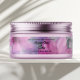 A bath and body care jar label with a background of pink and purple flowers and black text.