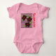 Künstlerischer und moderner Anzug mit blühenden Karosserien, rosa Säugling-Babybekleidung mit schwarzen Blume und schwarzen Streifen. Der wachsende Text kann mit Ihrer eigenen Nachricht personalisiert werden, oder mit einem Babynamen für ein schönes Geschenk.