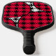 Dieses Pickleball-Paddel hat ein modernes Design aus massiven schwarzen Diamanten in schwarzen Diamanten-Konturen mit rosa Flecken unter ihnen, alles auf einem Feld von Weiß.