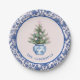Dieses Weihnachtsdesign hat ein prächtiges, großtausendjähriges Design mit einem Weihnachtsbaum in einem blau-weißen Chinoiserie Topf auf einem rot-rosa Hintergrund mit einem marineblauen Damast-Rand um den Rand.