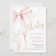 Pink Bow 30th birthday invitation. Modern feminine design in blush pink and gold. Features trendy watercolor coquette bow, and heart script font "thirty". Perfect for an elegant style women's bday celebration. Personalize with your own details. Printed Zazzle invitations or instant download digital printable template.