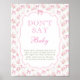 Entrez dans un monde de charme intemporel et de beauté tendre avec notre "Pink Bow Love Shack Dont Say Baby Poster", où chaque détail chuchote des contes d'amour et de nostalgie. Ce design enchanteur évoque l'essence de l'élégance vintage, avec des arcs roses délicats et des motifs floraux roses complexes qui ornent les objets. Chaque élément pour transporter les clients vers une époque révolue de romantisme et de sophistication, créant un sentiment de chaleur et de nostalgie qui résonne profondément avec les familles anticipant l'arrivée de leur petite princesse. Dans un décor aux teintes pastel douces et aux accents chics et froids, l'article dégage un sentiment d'élégance intemporelle, créant une atmosphère parfaite pour un baby shower rempli de joie et d'enchantement. Cliquez sur le bouton "Customiser" pour personnaliser davantage ce modèle. Vous pourrez modifier le nom, y compris le style, les couleurs et les tailles. Éléments correspondants disponibles.