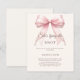 A soft ivory colored background, decorated with a pink bow with pearls. Personalize and add a name and party details.