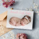 Niedliche und minimalistische Babyankündigung mit einem Foto Ihres Babys. Fügen Sie den Namen Ihres Kindes in einem rosa Kalligrafieschrift hinzu. Die Rückseite ist in Rosa und Weiß gehalten.