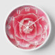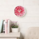 Ein Zimmer mit dieser stilvollen Wanduhr mit weißen Ziffern und dem Foto einer großen, rosa Kamelien-Blüte. Ein schönes, blumengeschmücktes Design! Verwenden Sie zum Dekorieren eines Wohnzimmers, Esszimmers, Küche, Schlafzimmers oder eines anderen Zimmers. Wählen Sie die Größe und den Stil der Uhr zusammen mit der Uhrzeigerfarbe aus.