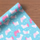 Rosa pastellfarbenes Urlaubspapier mit niedlichen Gegenständen wie Bonbons, Strümpfen und Geschenken auf blauen und aquamarinen Hintergründen.
