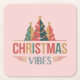 This coaster features a Christmas-themed graphic design of three stylized Christmas trees arranged on a pink background. The trees are in geometric shapes with red, green and gold colors. Below the trees is the text CHRISTMAS in large letters using a retro-style font, with red, gold and green letters. Underneath is the word VIBES in a teal-colored sans-serif font. The design includes decorative wing-like elements on either side of the text, consisting of red and gold lines that create a dynamic, flowing effect. The coaster is a square paper pulp coaster. There are six coasters in the set. The coaster dimensions are 4" by 4".