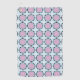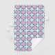 Towels with a pink circular pattern on a blue geometric background hang on a rack. Below, a matching washcloth is folded on a neutral surface.