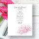 Das hübsche Pink Daisy Effect Floral Wedding Menu mit den Details des Essens, das Sie in Ihrem Brautparty Mittag, Ehe Empfang Dinner oder Post Hochzeit Brunch servieren, indem Sie den Salat oder erste Gänge, Vorspeise oder zweite Gänge und Nachtisch oder dritter Gaumen. Personalisieren Sie es mit den Namen der Braut und des Bräutigams, Ort und Datum. Dieses elegante botanische Hochzeitsmenü verfügt über ein digital erweitertes Blumenfoto mit einer rosa, gerberfarbenen, blühenden Blume mit weißem Hintergrund.