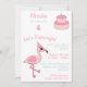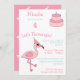 Eine niedliche und skurrile 4. Geburtstagsfeier mit einer Illustration eines rosa Flamingo-Vogels und einer zweistufigen Geburtstagstorte. Das Kunstwerk ist im kawaii-Stil gehalten und hat ein mädchenhaftes und hübsches Ambiente. Machen Sie Ihre individuelle Einladung noch heute!