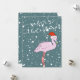 Frohe Weihnachten rosa Flamingo mit einer Weihnachtsmannmütze im fallenden Schnee. Erstellt durch © Lesruba Designs.