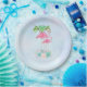 Teller aus Papier mit einer Abbildung eines Mama- und Baby-rosa Flamingo stehend auf einem Bett von blumengeschmückten Blume mit grünen Palmen im Rücken schweben. Tropisch und hübsch. Der Hintergrund ist hellblau.