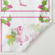 Ein Wandteppich mit einem tropischen Weihnachtsmuster. Ein extravagant rosa Flamingo mit einem Bein erhob sich. Tragen Sie eine rosa Weihnachtsmannmütze und etwas saisonale heilige. Holly mit Beeren schmücken auch die Ecken. Ein Blumenstrauß mit Bonbons über ihrem Kopf. Frohe Weihnachten in grüner, mutiger Schrift geschrieben.