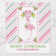 Ein skurriles Tropenflaschenlabel. Ein extravagant rosa Flamingo mit einem Bein erhob sich. Tragen Sie eine rosa Weihnachtsmannmütze und etwas saisonale heilige. Holly mit Beeren schmücken auch die Ecken. Ein Blumenstrauß mit Bonbons über ihrem Kopf. Ein rosa und grüne, mit Zuckerrohr gestreifter Hintergrund.