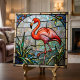 Add a splash of vibrant, artistic color to your home with this stunning pink flamingo design. This artwork features a sophisticated faux stained glass effect, capturing the intricate beauty of traditional leaded glass and mosaic patterns without the fragility. The design showcases a majestic pink flamingo standing amongst teal reeds and marsh waters, framed by an elegant border.