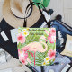Tropical style tote bag design features a pink flamingo framed with a Hawaiian island style pattern of vibrant pink, yellow, and white hibiscus flowers and a green palm leaf background. Personalize the custom script text for your girls' weekend, name, or other preferred wording. Tote bag features the same design front and back.