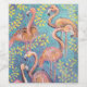 Gemälde mit niedlich rosa Flamingos auf lila Hintergrund mit blauen und gelben Blätter