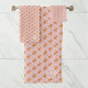 Blumenrosa Badetuch Set wird von der Größe erstellt. Die Gestaltungsstruktur basiert auf Blume, die als Blumenmuster auf hellrosa Hintergrund verwendet werden. Rechts unten ist Kreis mit Initialen.