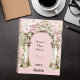 A soft pink background decorated with a large garden marble arch and pink flowers and faux gold infinity loop. The motivational quote: Drem. Plan. Bloom. Personalize and add your name and year.