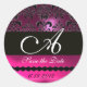 PINK FUCHSIA LILA DAMASK MONOGRAM, violett Runder Aufkleber