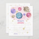 WATERCOLOR Magische Galaxie Weltraum Thema Geburtstagseinladung. Planeten und Sterne in rosa, lila, goldene Farbe.
