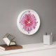 Hübsche dekorative Wanduhr in einem blassrosa-weißen Polka-Punktmuster. Eine rosa, grafisch verbesserte Gerber-Blüte, dekoriert die Mitte, und vier rosa Tasten kennzeichnen die Viertelstunde. Anpassen, um jeden gewollt Text hinzuzufügen. Stilvolle Uhr, die eine tolle Geschenkidee macht.