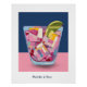 Dieses Bild ist eine farbenfrohe und künstlerische Illustration eines Pink Gin & Tonic Cocktails, der mit künstlerischer Intelligenz und Grafikdesign-Software erstellt wurde. Das Getränk wird in einem klaren Glas mit hellen Eiswürfeln im Mosaikstil dargestellt, die mit abstrakten rosa, roten, gelben, weißen, blauen und lila Blöcken bemalt sind. Ein Limoner Keilgarnisch auf der Felge, in stilisierten Grün- und Gelbtönen gestrichen. Der Hintergrund ist horizontal geteilt - die obere Hälfte ist marineblau und die untere Hälfte rosa, passend zum Farbthema des Getränkes. Unter dem Bild, in einem kursiven marineblau-blauen Schriftart, steht: "Pink Gin & Tonic".
