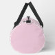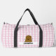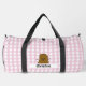 Bezaubernde Duffeltasche mit einer niedlichen, fröhlichen Cartoon braunen Kartoffel. Der Hintergrund ist ein niedliches klassisches Muster aus rosa und weißem Gingham. Eine Vorlage unter der Kartoffel, um Ihren Namen hinzuzufügen.