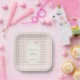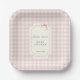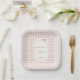 Feiern Sie die bevorstehende Ankunft eines kleinen Mädchens mit dieser charmanten Babyduschplatte, die mit einem klassischen rosa Gingham-Rahmen und -Rücken, eleganten, grauen Skript-Schriftart und einem süßen Aquarellbogen oben besticht. Dieser Teller ist perfekt für eine Feier im Landhausstil und zugleich gemütlich und stilvoll.