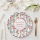 Teller aus Papier mit einem sich wiederholenden Farbmuster aus rosa Pampelmusen, die mit Aquarellfarben erzeugt wurden, Set auf einem pastellgrünen und weiß gestreiften Muster. In der Mitte befindet sich ein weißer Kreis mit goldfarbenem Rahmen, in dem Sie Ihre personalisierten Geburtstagsinfos erhalten.