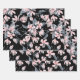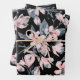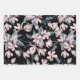 Papierblätter mit elegantem Muster, die mit einer Aquarellbilderin von rosa Blume mit blau-grauen Blätter und Stielen versehen sind. Klassischer schwarzer Hintergrund.