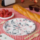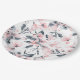 Teller aus Papier mit elegantem Muster, die mit einer Aquarellbilderung von rosa Blume mit blauen grauen Blätter und Stielen versehen sind.