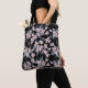 Eine Tasche mit elegantem Muster, die mit einer Aquarellabbilderung von rosa Blume mit blau-grauen Blätter und Stielen versehen ist. Klassischer schwarzer Hintergrund hinter dem Muster.