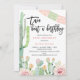 Pink Green Fiesta Taco Bout A Birthday Invitation Pastel teinté de la fiesta taco à l'occasion d'une invitation d'anniversaire avec des cactus à fleurs et bannière mexicaine en rose et menthe. Idéal pour quelqu'un à la recherche d'un taco pour fille ou une invitation à l'anniversaire sur le thème de la fiesta pour tout âge.