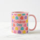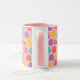 This mug features a pink gumdrop candy cute comic image. The image shows many cute gumdrops on a pink background. The words Gumdrop Day are in text centered on the image. This picture is a cute holiday image for Gumdrop Day which is celebrated on February 15th every year. The image is on both sides of the mug. The mug is a pink and white combo mug. The mug has a pink handle and a pink glaze interior. The mug is an eleven ounce mug.