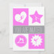 Personalisierte Party Einladungen mit rosa und weißen Quadraten gefüllt mit Gymnastik-Silhouetten der anderen Farbe. Es hat auch eine einfache Anpassung von Textfeldern, um Ihre Informationen hinzuzufügen, bevor Sie bestellen! Sie können auch die Schriftart ändern, indem Sie auf die Schaltfläche "Anpassen" klicken.