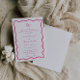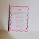 Whimsical handschriftlich Cerise Pink, Hochzeit Einladung. Vorlagenfeatures, handgezeichneter Rahmen mit gewellten Linien und Hochzeitsringe doodle, hellrosa Streifen Hintergründe.