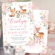 Joli hiver rose merveilleuse bois boisé invitation fille d'anniversaire avec les animaux de la forêt : renard, lapin et cerf.