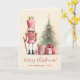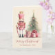 Wir hoffen, dass Sie unseren zauberhaften rosa Nutcracker so viel Liebe wie wir tun. Er ist so niedlich! Hier ist er in einer Weihnachtsfeierszene mit dekoriertem Urlaubshaus und einer Reihe passender Geschenke. Die Szene stammt aus einem Vintagen Aquarelldesign. "Frohe Weihnachten!" ist der Gruß, den man ändern kann, wenn man will. Auch die vorgeschlagene Phrase im Inneren ist editierbar. Stellen Sie sicher, dass Sie Familienname und Datumssymbole bearbeiten, die sich auf der Vorderseite der Karte und auch innerhalb der Karte befinden.