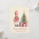 Unser bezaubernder rosa Nutcracker ist in einer Weihnachtsfeierszene mit einem dekorierten Urlaubshaus und einer Reihe von Geschenken. Die Szene stammt aus einem Vintagen Aquarelldesign. So niedlich! "Frohe Weihnachten!" ist der Gruß, aber du kannst es ändern, wenn du willst. Stellen Sie sicher, dass Sie Familienname und Datumssymbole bearbeiten. Die Kartenrückseite wird für Ihre optionale handgeschriebene Meldung leer verlassen.