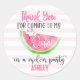 Pink one in a melon merci autocollant d'anniversaire Cute rose watercolor one is a melon anniversaire favker Merci sticker avec une grande tranche de pastèque et un texte d'aquarelle décorative sur un arrière - plan rayé blanc et rose.