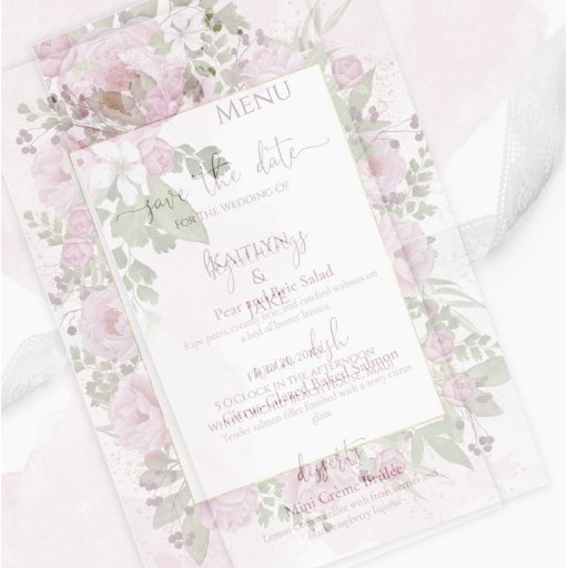 A soft pink floral wedding invitation with pink peonies in a polygonal frame