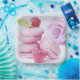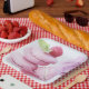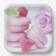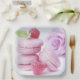 Teller aus Papier mit einem herrlichen Foto mit einem Turm aus rosafarbenen Makaronen mit Himbeeren in der Umgebung. Wunderbar göttlich.