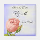 Ein Save the Date Magnet mit Skriptbuchstaben und Platz für Ihren eigenen Text, mit einer hübsch rosa Rose mit einem kleinen Rosenbud dekoriert, gerade zu öffnen auf einem cremefarbenen und himmelblauen Hintergrund.