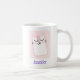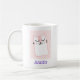 Eine Tasse mit einer Abbildung einer niedlichen schlafenden Kätzin. Die Augen sahen glücklich und friedlich aus. Set auf einem hellrosa Hintergrund.